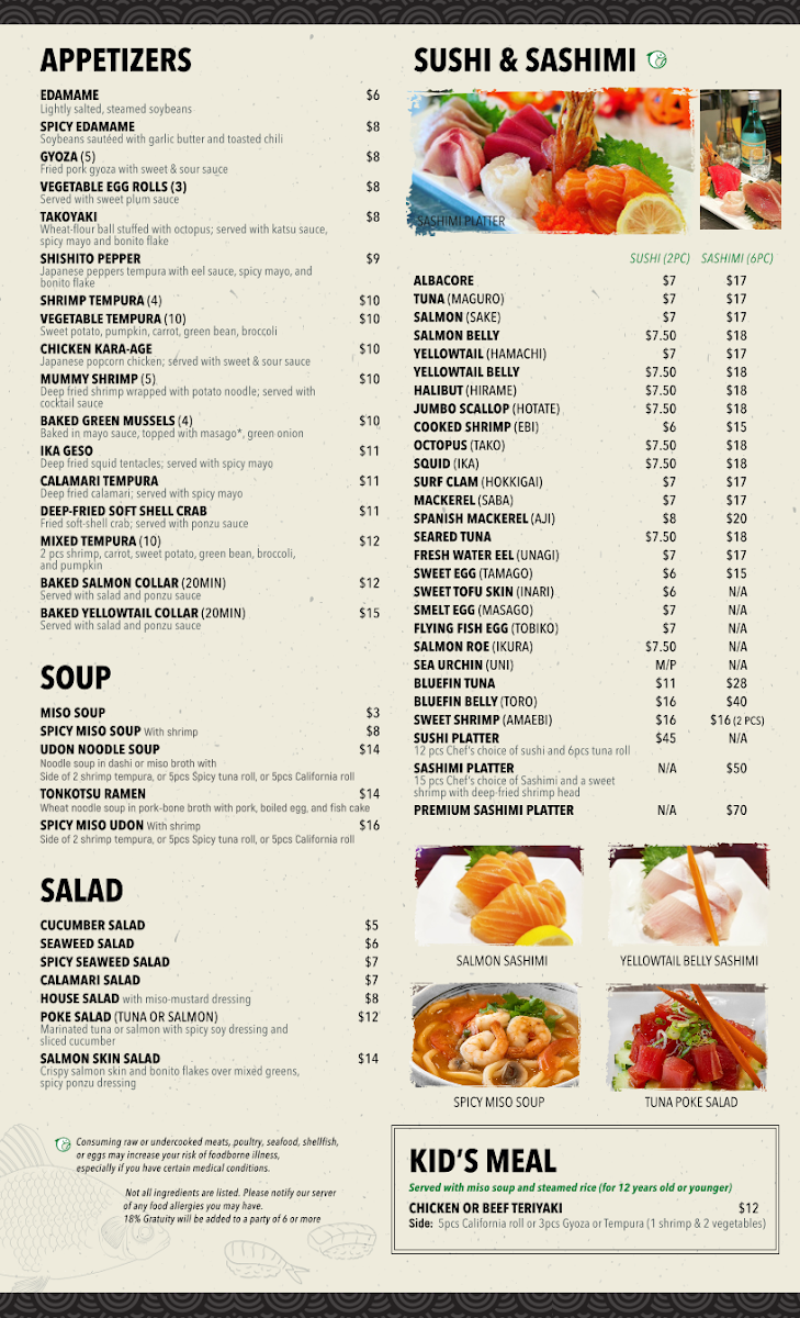 Noodle soup in dashi or miso broth with a choice of 2pcs shrimp tempura, or 4pcs Spicy tuna roll, or 4pcs California roll